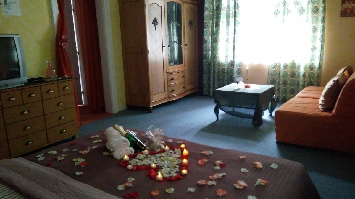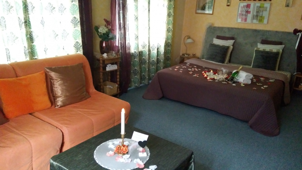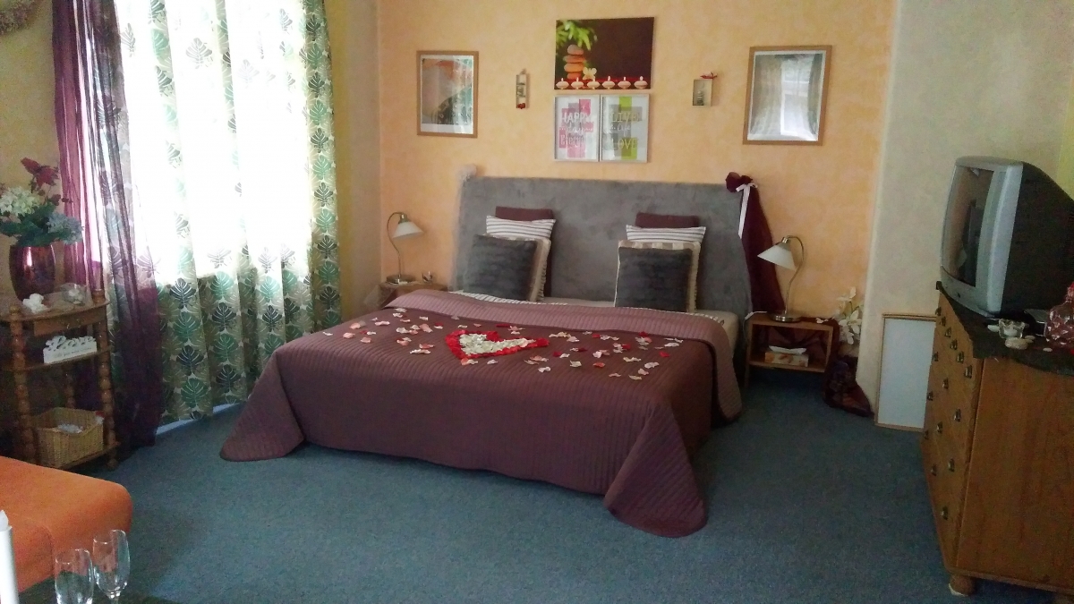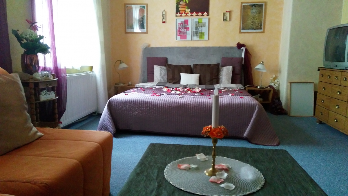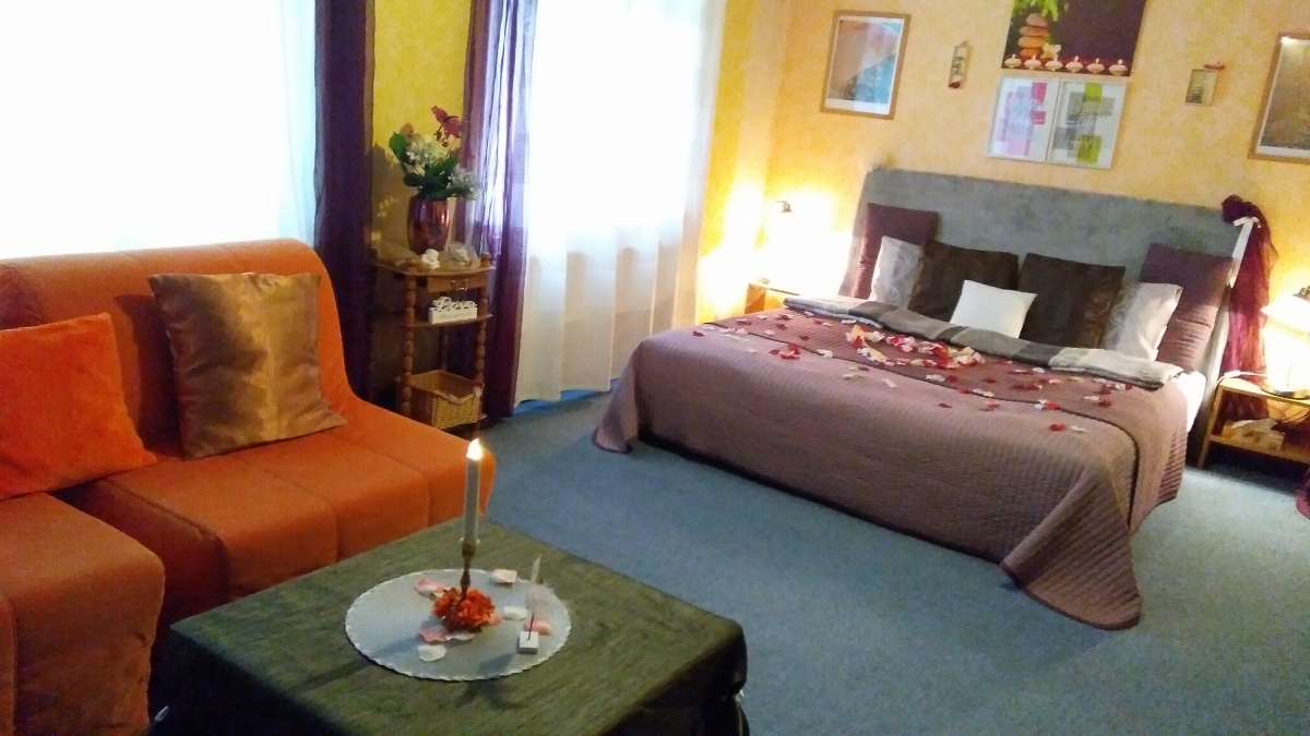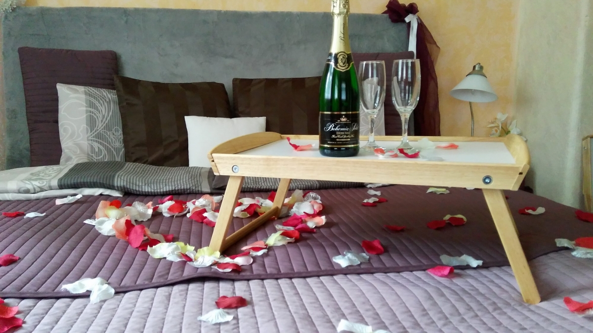 Apartmán Podzim se nachází v přízemí Vila Fantazie. Je laděný do zemitých barev a odstínů, které v podzimním období dotváří atmosféru za okny vedoucími na východ a jih. Prostorný apartmán nabízí hostům k posezení dvě křesla s konferenčním stolkem. Koupelna je vybavena hydromasážní vanou pro dvě osoby ve tvaru srdce, vanu pro dvě osoby má také apartmán Zima v přízemí. Apartmán Podzim disponuje plně vybaveným kuchyňským koutem, v chladničce jsou připraveny nápoje. Snídaně a večeře, které nosíme hostům si vychutnáte u jídelního stolu, nebo na postelovém tácu, kterými je každý apartmán vybaven.